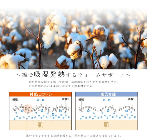 【綿で吸湿発熱!】綿に特殊な加工を施して吸湿・発熱機能を持たせた新素材を使用しています!お肌に触れる表のパイル部分はすべて綿100%です! 【湿気を吸収し発熱する!】人間の体は寝てる間にコップ1杯分の汗をかくと言われています。